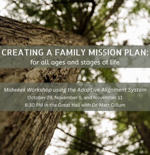 Join Dr. Matt Gillum in The Great Hall for Family Mission Planning, a workshop style class on creating a missional mindset and plan for your family. This is for all ages and stages. There is no registration required and you can join at any time.